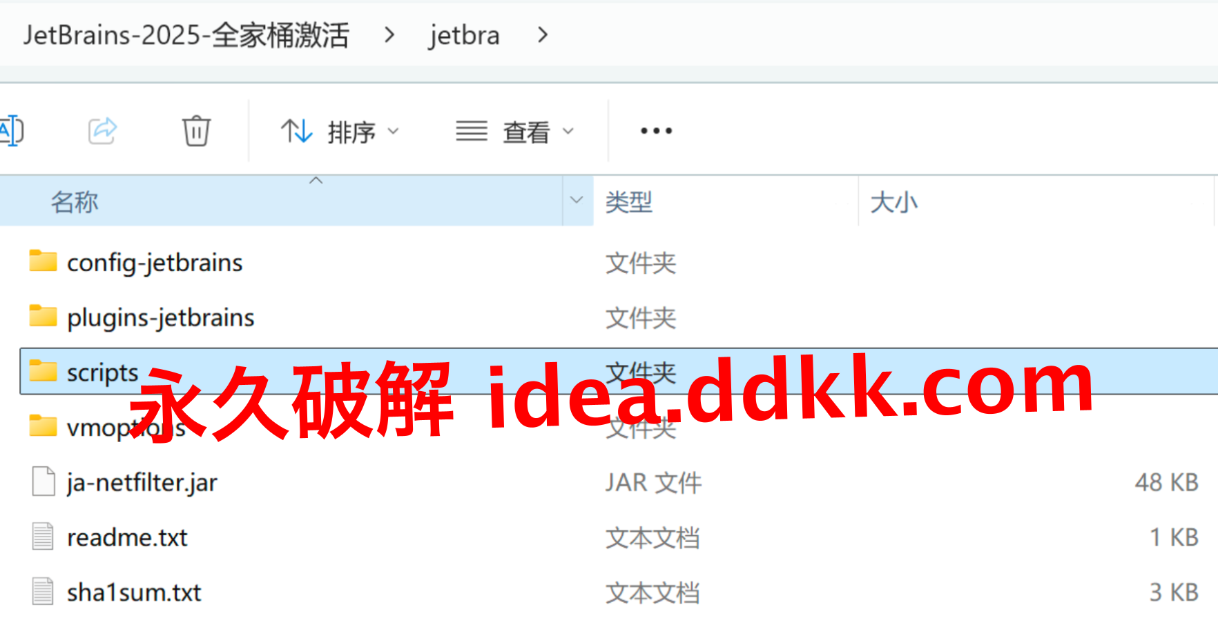 这个目录下全是脚本文件,Windows 用的、Mac 用的、Linux 用的,三套都在里头。脚本的作用是自动往 datagrip.vmoptions 这个配置文件里写入破解补丁的引用路径,省去你手动改文件的麻烦,对不熟悉 JetBrains 配置文件的人省事很多。