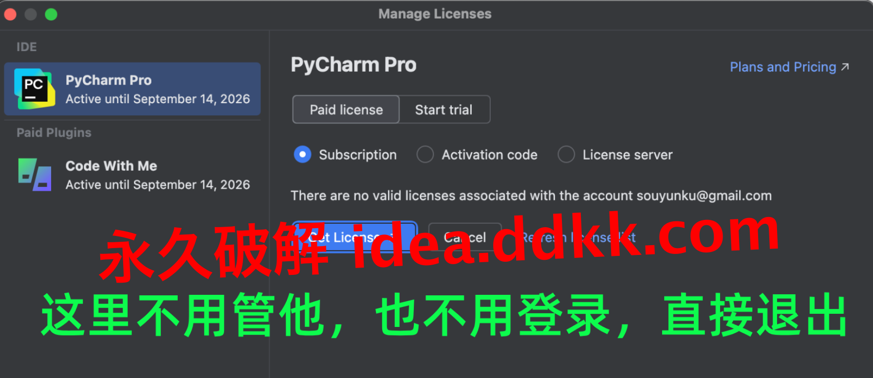 你现在的任务只有一件事:找到 Exit,点掉,把PyCharm关掉。对,就是这么简单粗暴,看见登录框直接退出,一个字都不用填,一个按钮都不用点(除了Exit)。