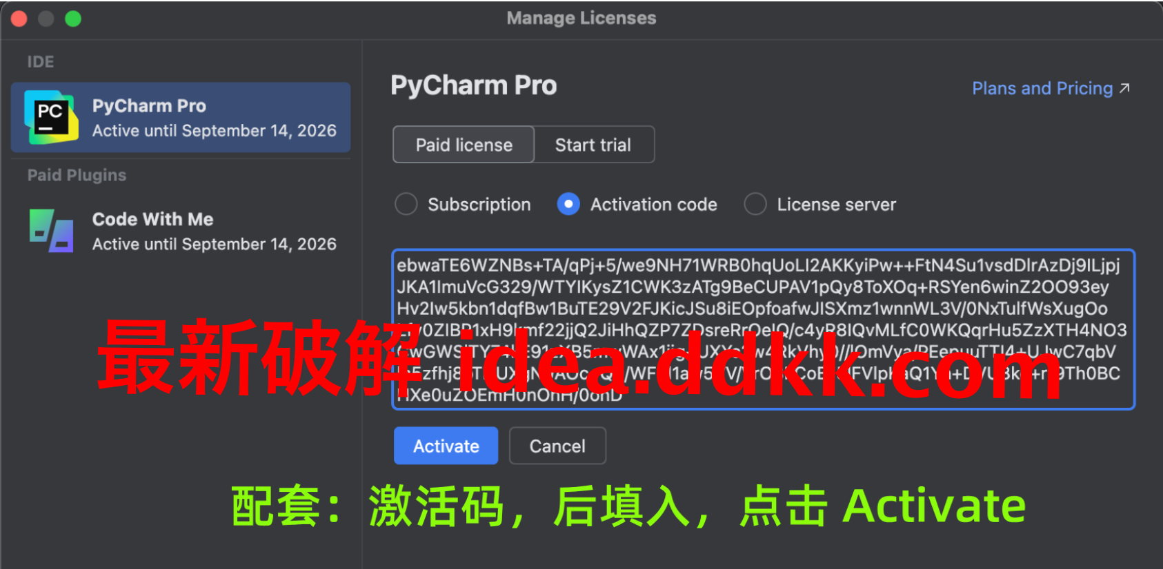 重新启动PyCharm,这次不用 Exit 了,进到激活界面,找"Activation Code",把激活码复制进去。复制的时候干净一点,不要多复制前后空格,不要手打,直接粘贴,减少出错概率。