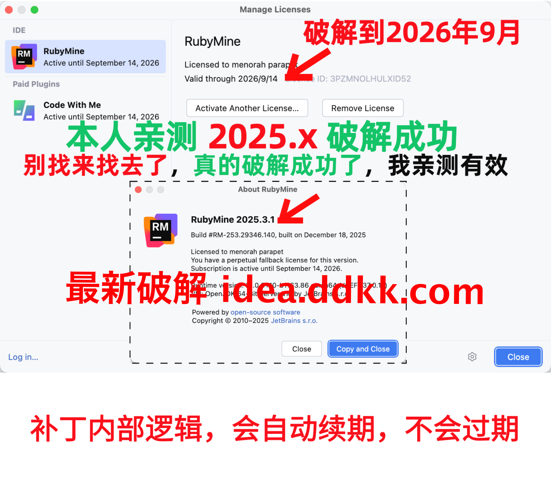 补丁或激活码版本太旧了,老版本的用不了,得下最新版的才行;补丁文件夹的路径里有中文或者空格,这个之前我说过,路径必须全英文,像"C:\RubyMine\2025.3.1\patch"这样才行,不能放"我的文档RubyMine破解\补丁"这种带中文的地方;还有一个办法是补丁装完后重启下系统,然后再输激活码,有朋友试了这个方法就成功了。