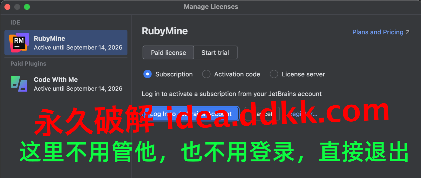 补丁装好之后,就该输入激活码了,这里有个关键点需要注意,JetBrains每个产品对应的激活码都不一样,RubyMine有RubyMine专用的激活码,别拿IDEA或者其他产品的激活码来用,那肯定激活不了