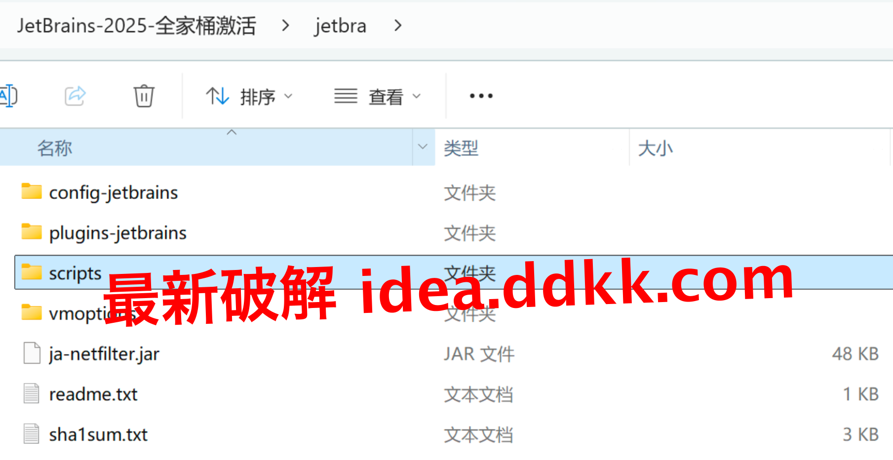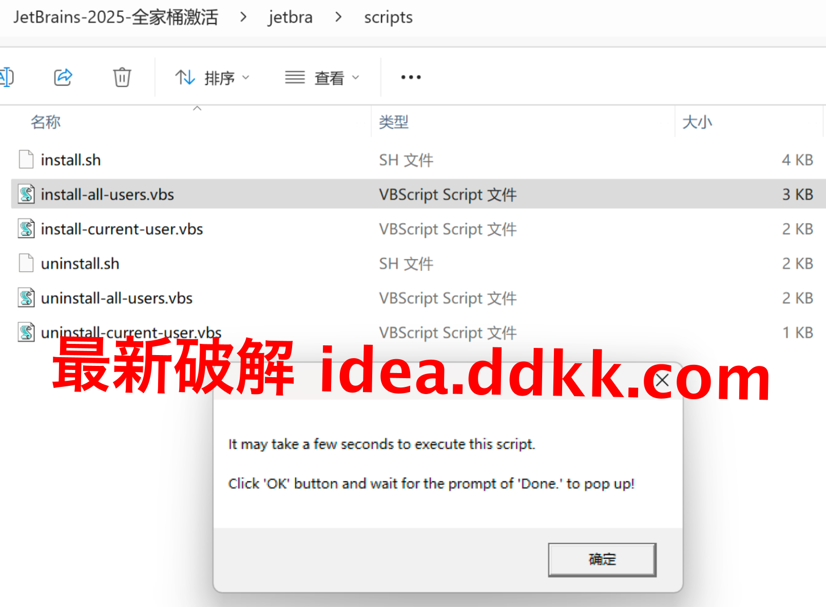 现在开始正式安装补丁了,先把jetbra这个文件夹找个纯英文路径放好,记住千万别放桌面,也别放中文目录,Windows系统双击install-current-user.vbs这个文件就行,Mac和Linux系统运行install.sh脚本