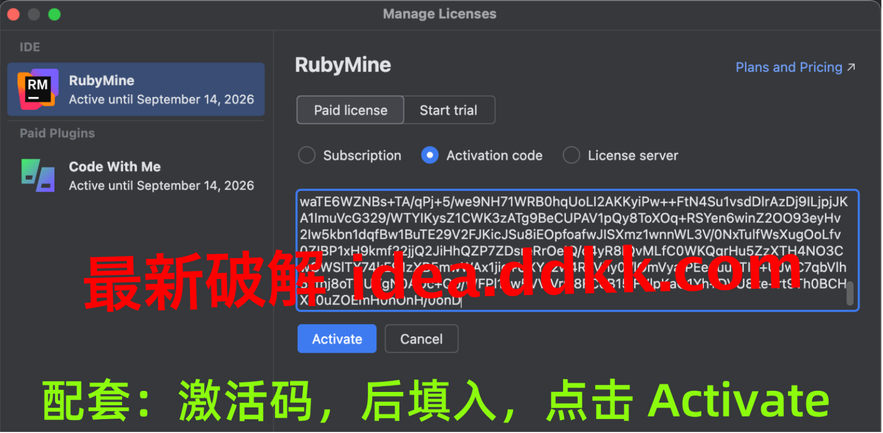 激活码在那个链接页面里找,打开网页后找到RubyMine那一行,直接複製就行,记得要複製全了,别少字符,拿到激活码后,在RubyMine的激活窗口选Activation code,然后把码粘貼进去,点Activate按钮就完成激活了