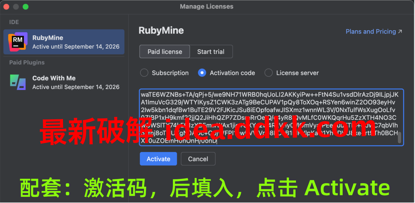 补丁就位了,现在重新打开 RubyMine,这回不要点 Exit 了,在激活界面输入激活码。