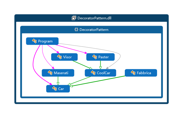 命名空间DecoratorPattern中包含汽车Car类、玛莎拉蒂Maserati类、法拉利Fabbrica类、酷汽车CoolCar类、汽车车贴Paster类和汽车遮阳挡Visor类。本示例通过使用装饰者模式为汽车进行一次简单的外观装饰。
