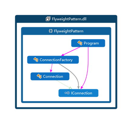 命名空间FlyweightPattern中包含IConnection接口充当抽象享元,Connection类充当具体享元,ConnectionFactory工厂类充当享元工厂。本案例通过使用享元模式来共享数据库连接。