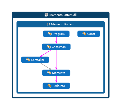 命名空间MementoPattern中包含Memento备忘录类,Caretaker管理者类,象棋Chessman类。本案例将向大家演示如何撤销或重做对象棋位置的修改操作。本案例使用栈以支持多次撤销,并且重做支持前1次的多次撤销。本案例不支持重新设置棋子位置时所产生的分支。