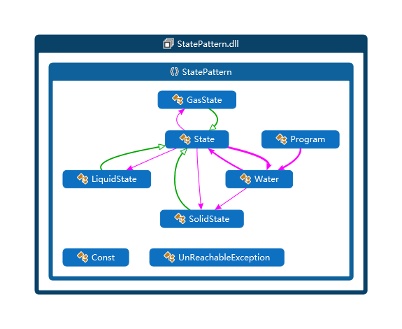 命名空间StatePattern中包含抽象状态类State,代表水的3种状态,0度及以下时为SolidState固体状态,0到100度为LiquidState液体状态,100度及以上时为GasState气体状态,并且不同的状态可以改变水类Water中喝水Drink方法的行为。本案例尝试以水的3种不同状态来向大家阐述状态模式在实际开发中的应用。