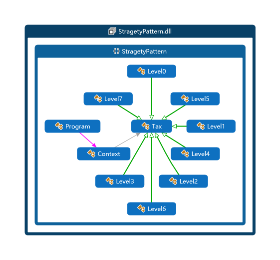 命名空间StragetyPattern中包含策略基类Tax以及它的8个实现类,Context环境类持有策略基类。本示例通过一个优雅的方式来计算个人所得税。