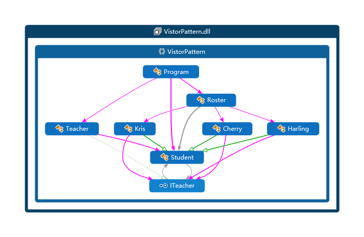 命名空间VistorPattern中包含Student学生基类充当抽象元素,它的3个实现类Kris、Cherry和Harling分别是我的儿子、女儿和侄女的英文名,它们充当具体元素角色。ITeacher接口充当抽象访问者,而Teacher类充当具体访问者。花名册类Roster充当结构对象。本案例尝试使用老师根据花名册来进行家访这样的场景来讲述访问者模式的使用方法。