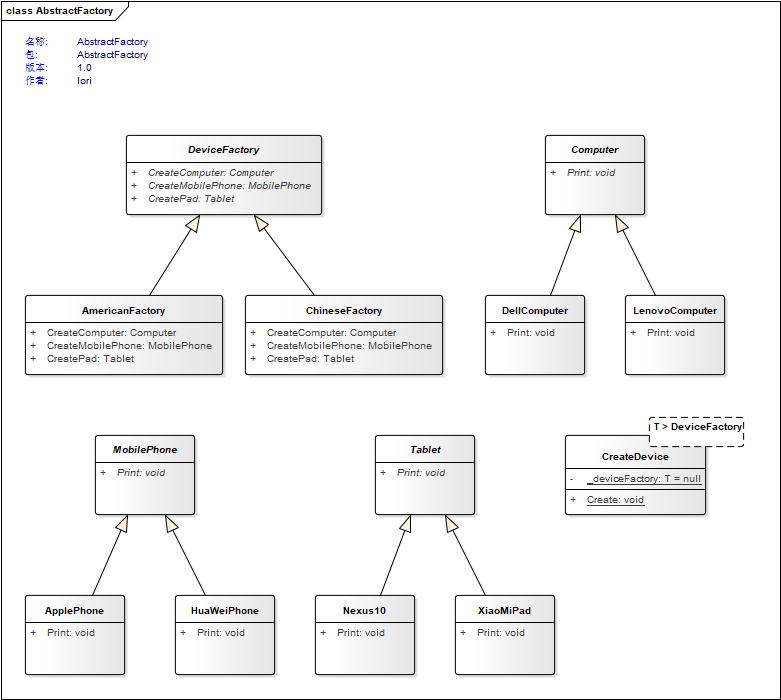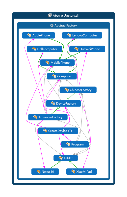 命名空间AbstractFactory中包含手机基类MobilePhone、便携式设备基类Tablet和计算机基类Computer,以及它们对应的6个实现类。抽象设备工厂类DeviceFactory包含2个实现类中国工厂ChineseFactory类和美国工厂AmericanFactory类。在智能设备竞争如此激烈的今天,我将尝试用2个不同的工厂来生产一批智能设备,以使大家能够了解抽象工厂模式的正确使用方法。