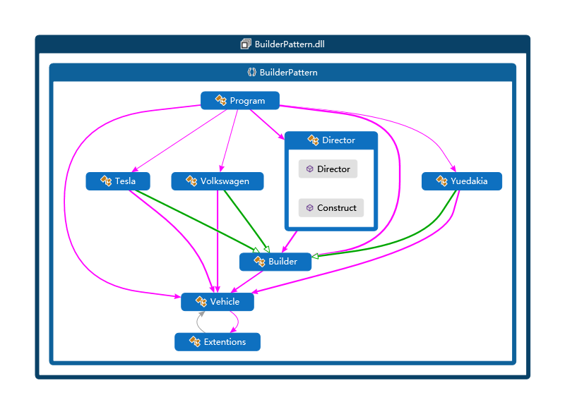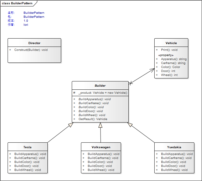 命名空间BuilderPattern中包含Vehicle机动车类充当产品类,Builder基类为抽象建造者,东风悦达Yuedakia类、大众汽车Volkswagen类、特斯拉Tesla类。另外包含1个机动车扩展类和1个指导者。本示例向大家演示3个不同的汽车厂商在生产比较复杂的汽车时所采用的策略。
