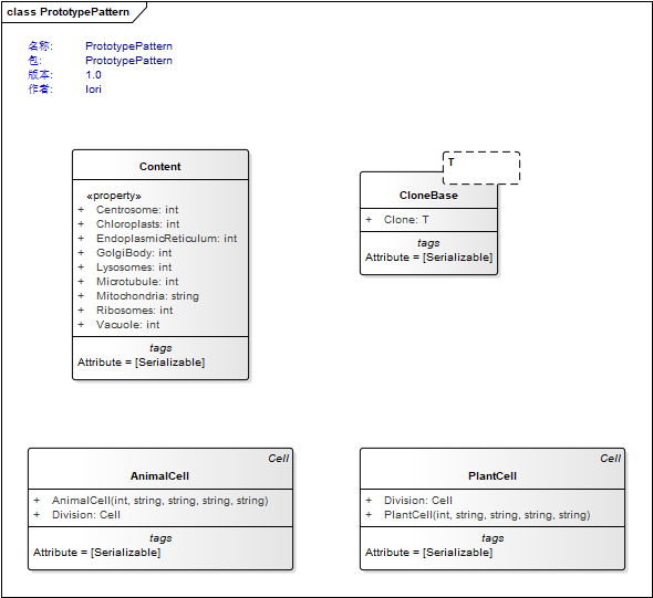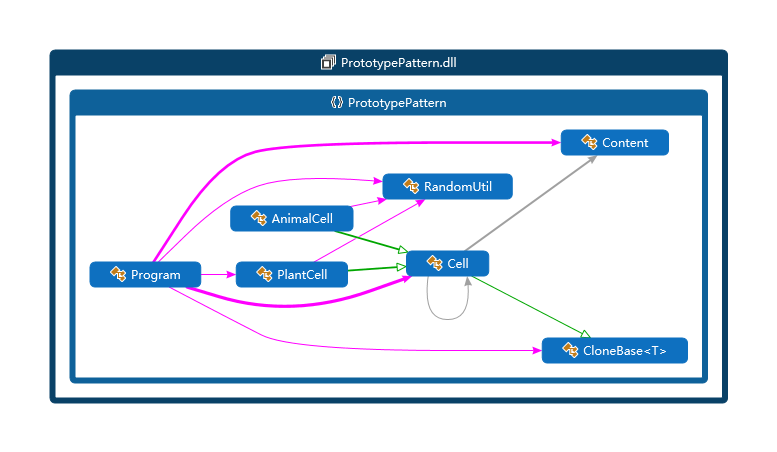 命名空间PrototypePattern包含细胞基类Cell,它的2个实现类分别为:PlantCell植物细胞类和Animal动物细胞类,另外包含CloneBase泛型基类。本案例尝试模拟细胞的分裂过程以展示原型模式在复制对象本身方面的独到之处。