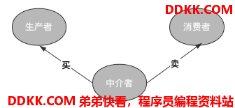 生产者生成各类产品,中介者购买生产者的产品再转卖给消费者,生产者和消费者不直接进行接触: