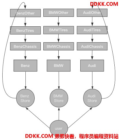 但是在抽象工厂模式下,购车造车时专卖店必须负责车辆配件的来源,如发生假冒伪劣产品必须承担责任,如下图所示: