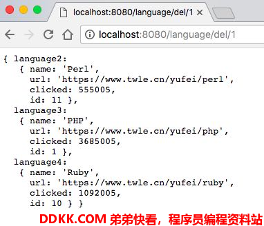 最后我们创建 RESTful API /language/del/:id 用于删除指定语言的详细信息