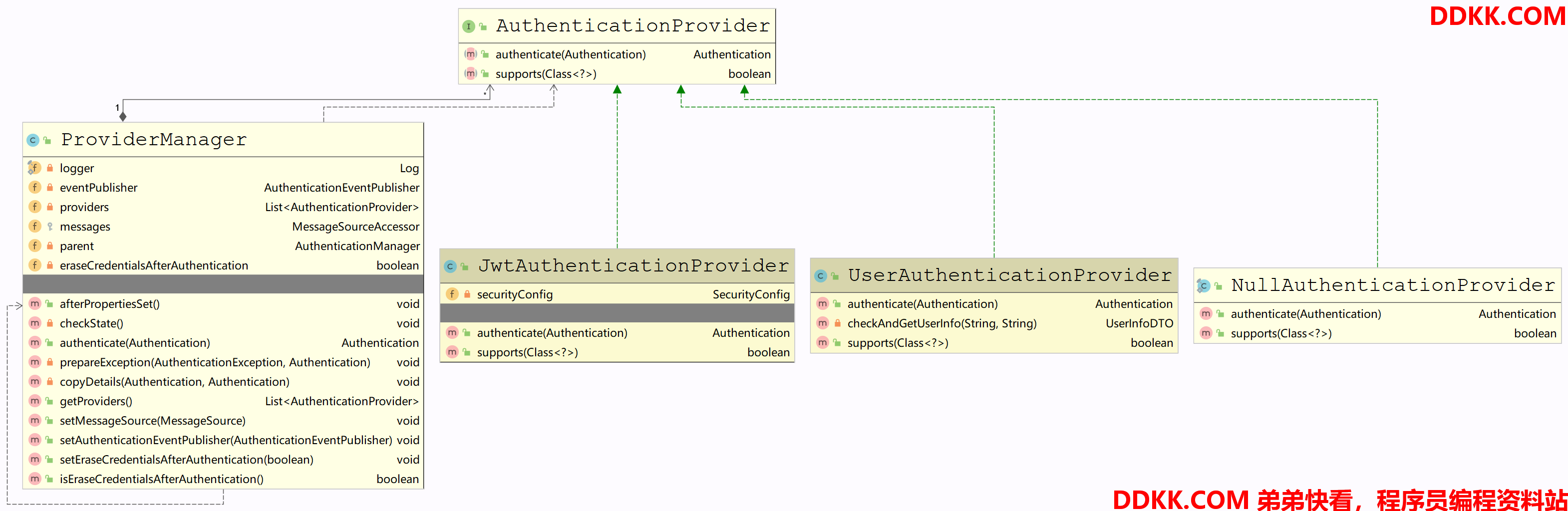 - 这里是典型的 策略模式+委托模式 的组合使用案例,如下UML类图,AuthenticationProvider 为策略接口,右边三个就是实际的策略类,实现了策略接口以及实现了 supports() 和 authenticate(),中间两个就是我们自己定义的Provider,这就是为啥我们要实现 AuthenticationProvider 接口。