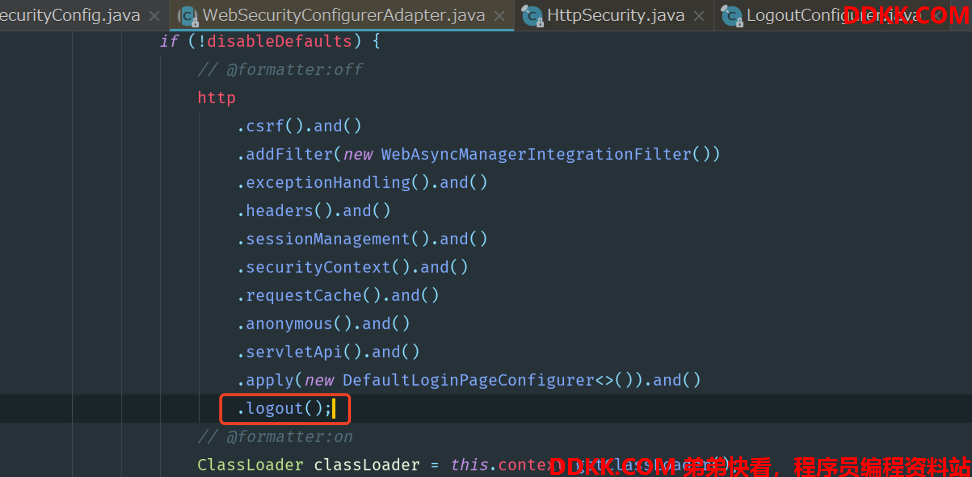 当我们编写SecurityConfig类,继承WebSecurityConfigurerAdapter类时,这时候我们打开WebSecurityConfigurerAdapter类的源码,就可以在WebSecurityConfigurerAdapter中的getHttp()方法中,发现默认就有对logout()的配置实现,如下图所示。