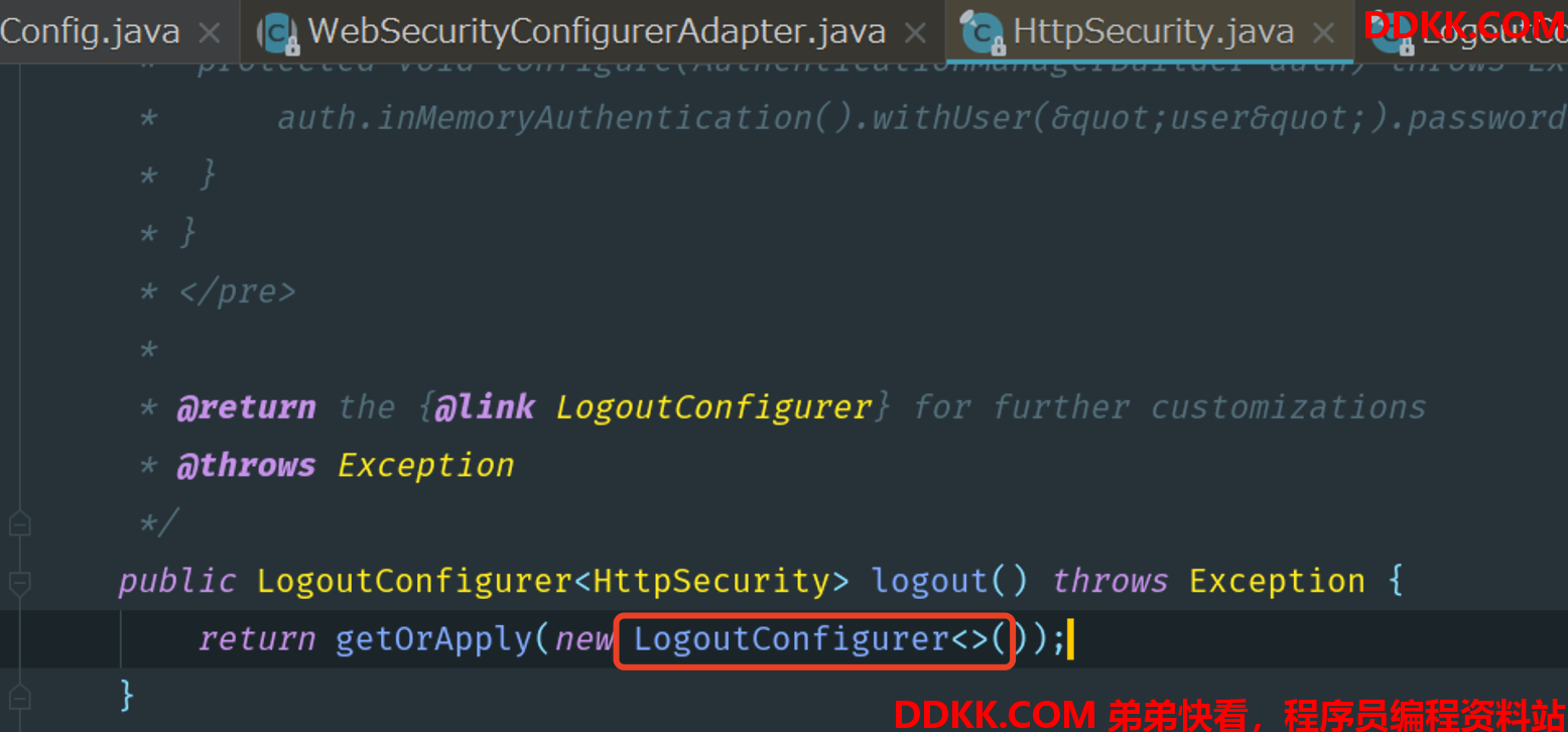 我们点击logout()方法,进到logout()方法的源码中,可以看到其内部实现,关联执行一个LogoutConfigurer类对象。