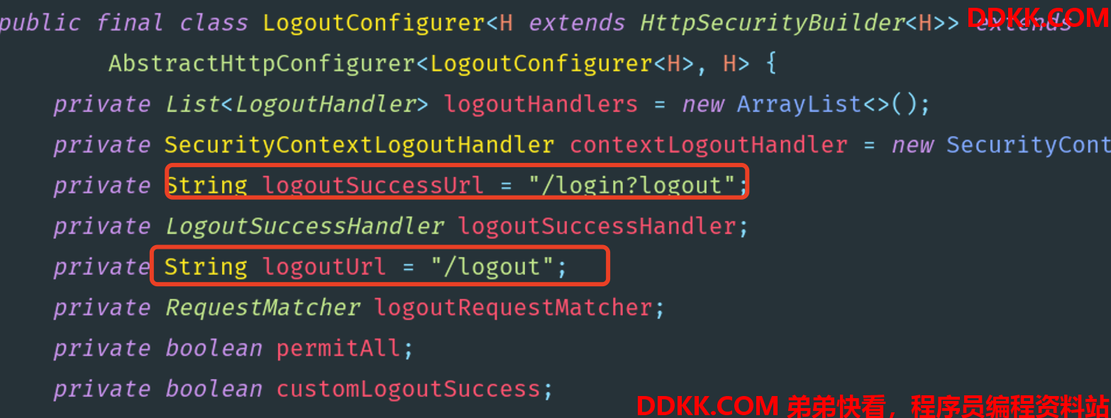 我们继续进入到LogoutConfigurer类中,在该类中可以发现有对默认退出登录地址的属性定义。
