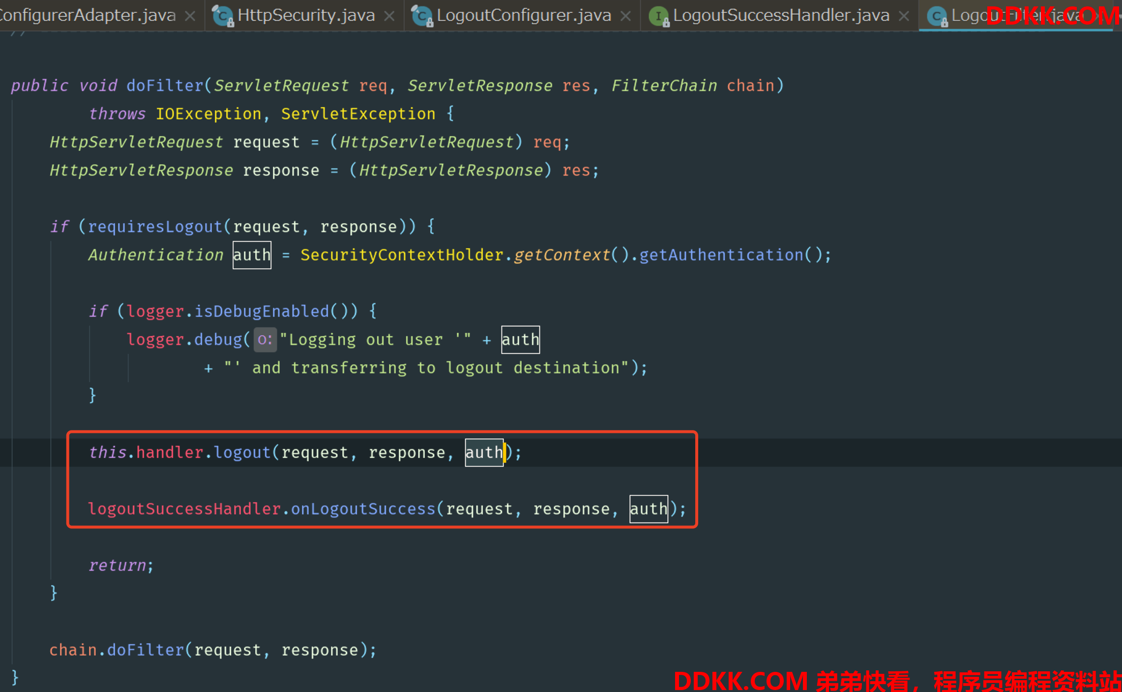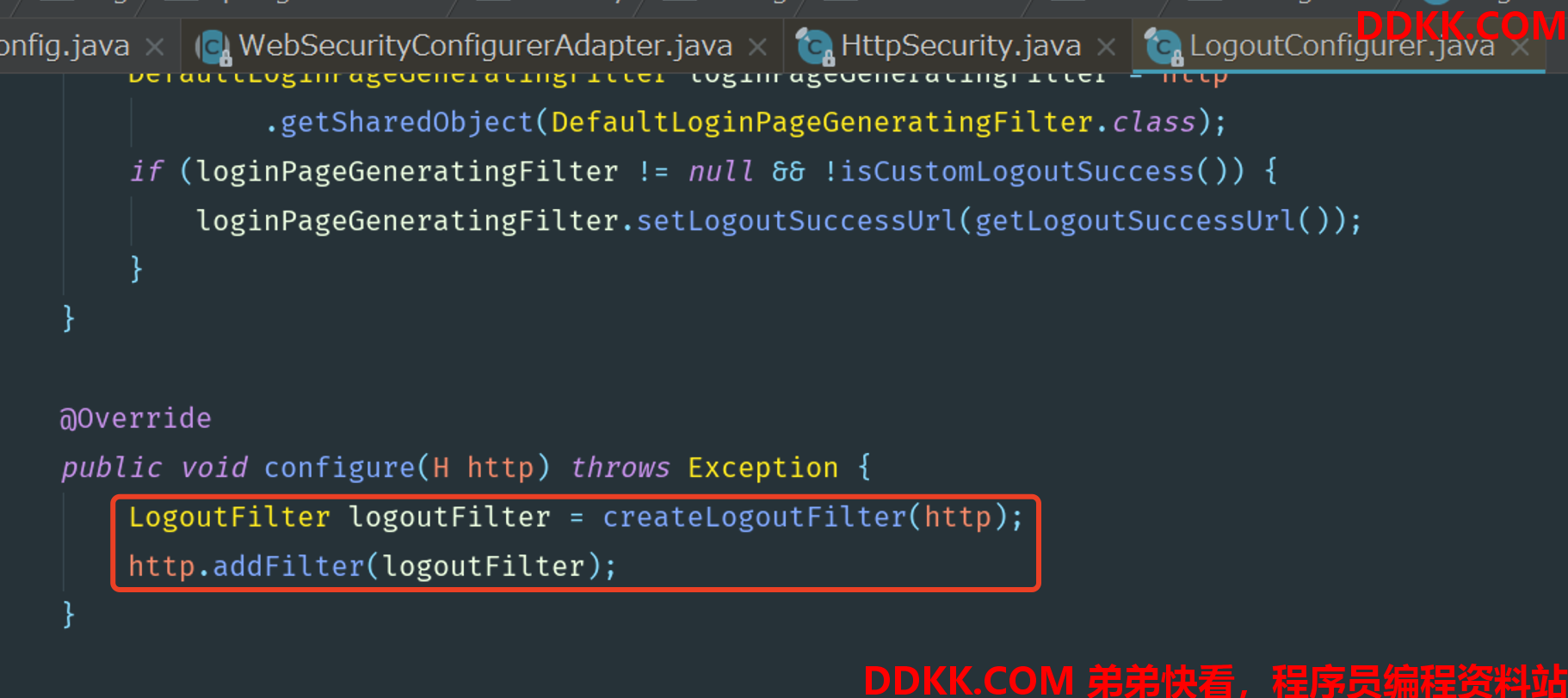并且在LogoutConfigurer类中,还通过configure()方法添加了对LogoutFilter过滤器的配置。