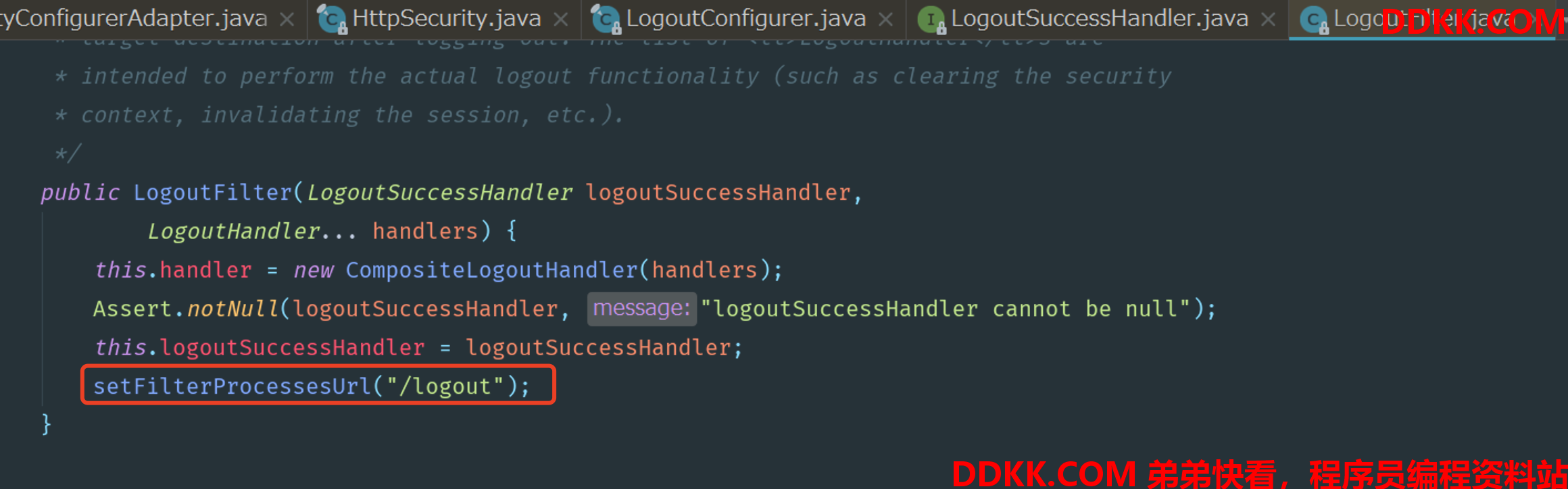 然后我们进入到LogoutFilter过滤器中,首先会发现在该过滤器的构造方法中传递进来了LogoutSuccessHandler,LogoutHandler两个重要的参数,并且添加了对“/logout”地址的配置。