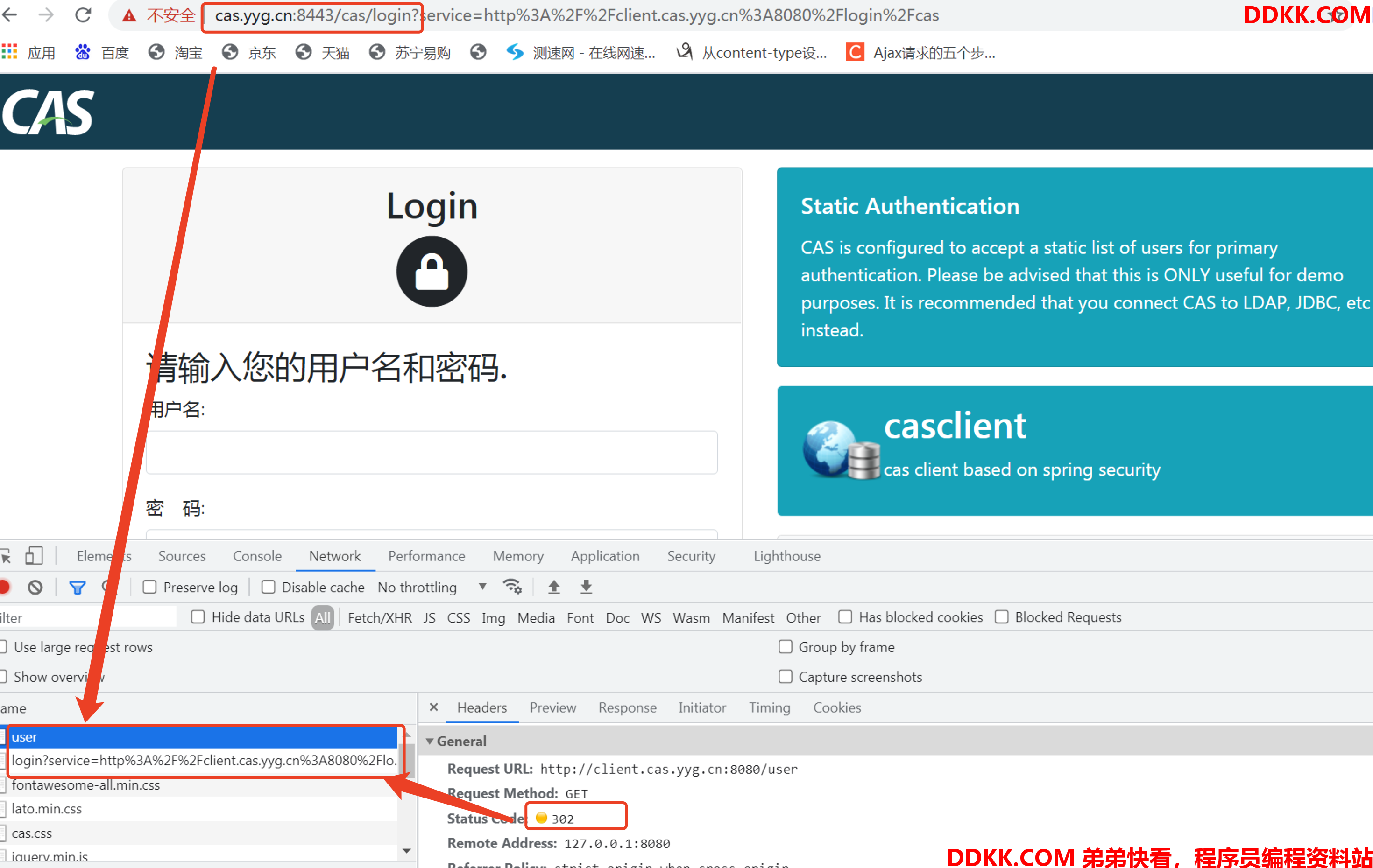 在我们输入http://client.cas.yyg.cn:8080/user地址后,在浏览器控制台,我们可以发现访问该接口时产生了一个302重定向,会从/user接口重定向到了CAS Server的/cas/login登录界面,这里需要我们输入之前在CAS Server的application.properties配置文件中配置的用户名和密码,yyg:123