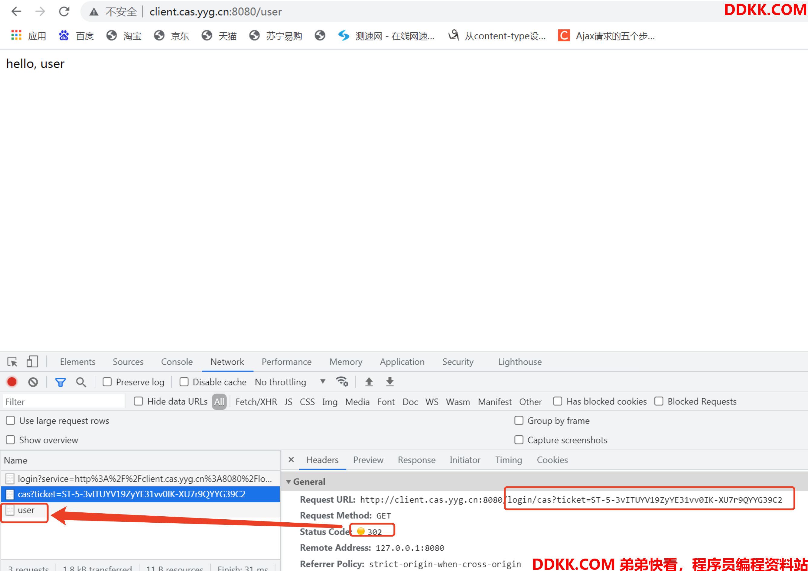 当我们输入正确的用户名和密码,CAS Server认证成功后,就会重新从CAS Server端重定向回到CAS Client端,从而实现对/user接口的访问。