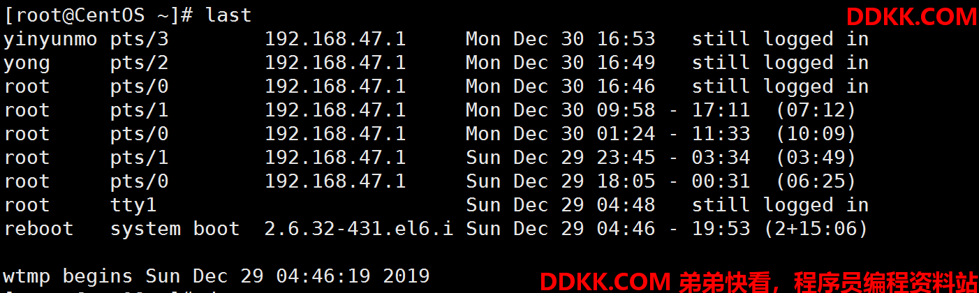 last可以查看计算机登录、重启的历史记录: