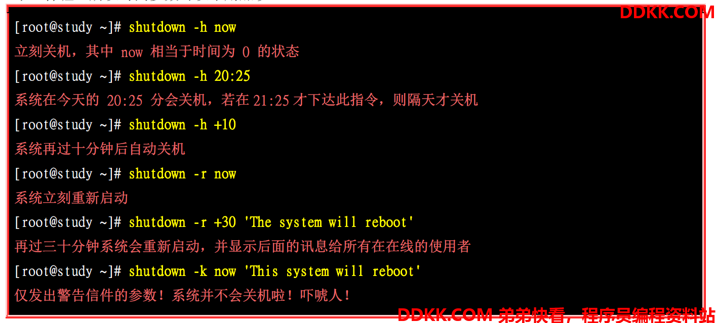 shutdown关机或重启,-h代表关机,-r代表重启,选项后还可以加时间,如果是now就代表立即,还可以加20:30表示定时执行任务。-c可以取消前一个关机命令,单纯执行shutdown后系统会在一分钟后关机。shutdown还可以显示一些提示信息: