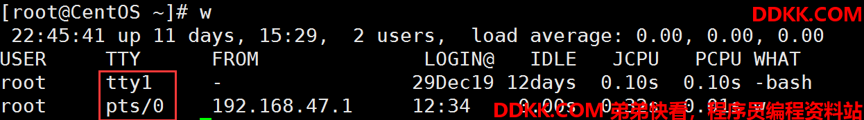 发现root用户正在登录,且登录了2次,一次是本地登录(在虚拟机中),tty表示本地登录,pts表示远程登录,数字代表终端号,表示不同终端,还可以看到登录时间、登录主机的IP地址。