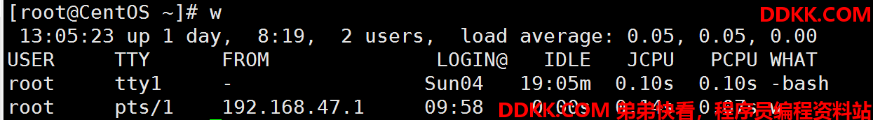 pkill命令和killall类似:pkill [选项] [信号] 进程名,选项有-t后加终端号,可以按照终端号踢出用户。首先执行w命令查看正在登录用户的终端号: