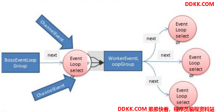 3、 WorkerEventLoopGroup会由next选择其中一个EventLoop来将这个SocketChannel注册到其维护的Selector并对其后续的IO事件进行处理;