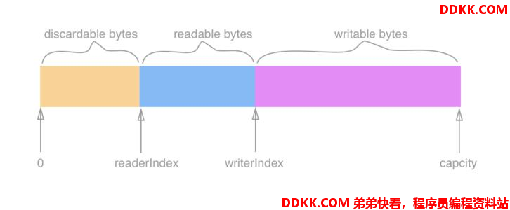 // 3、通过 readerIndex、writerIndex 和 capacity,将buffer分成三个区域