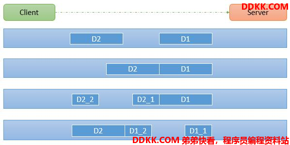 4、 服务器端分两次读取到了数据包,第一次读取到了D1包的部分内容D1_1,第二次读取到了D1包的剩余部分内容D1_2和完整的D2包;