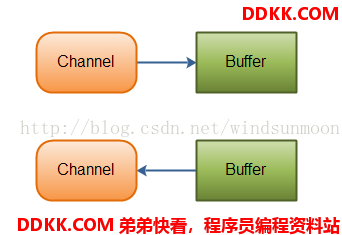 - 通道可以从缓冲读数据,也可以写数据到缓冲