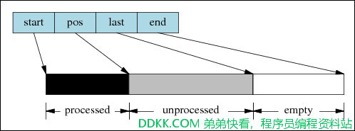 一般buffer 结构体可以表示一块内存,内存的起始和结束地址分别用 start 和 end 表示,pos 和 last 表示实际的内容。如果内容已经处理过了,pos 的位置就可以往后移动。如果读取到新的内容,last 的位置就会往后移动。所以 buffer 可以在多次调用过程中使用。如果 last 等于 end,就说明这块内存已经用完了。如果 pos 等于 last,说明内存已经处理完了。下面是一个简单的示意图,说明 buffer 中指针的用法: