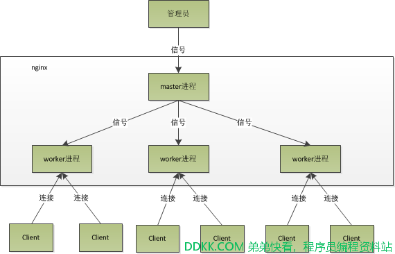 在Nginx 启动后,如果我们要操作 Nginx,要怎么做呢?从上文中我们可以看到,master 来管理 worker 进程,所以我们只需要与 master 进程通信就行了。master 进程会接收来自外界发来的信号,再根据信号做不同的事情。所以我们要控制 Nginx,只需要通过 kill 向 master 进程发送信号就行了。比如kill -HUP pid,则是告诉 Nginx,从容地重启 Nginx,我们一般用这个信号来重启 Nginx,或重新加载配置,因为是从容地重启,因此服务是不中断的。master 进程在接收到 HUP 信号后是怎么做的呢?首先 master 进程在接到信号后,会先重新加载配置文件,然后再启动新的 worker 进程,并向所有老的 worker 进程发送信号,告诉他们可以光荣退休了。新的 worker 在启动后,就开始接收新的请求,而老的 worker 在收到来自 master 的信号后,就不再接收新的请求,并且在当前进程中的所有未处理完的请求处理完成后,再退出。当然,直接给 master 进程发送信号,这是比较老的操作方式,Nginx 在 0.8 版本之后,引入了一系列命令行参数,来方便我们管理。比如,./nginx -s reload,就是来重启 Nginx,./nginx -s stop,就是来停止 Nginx 的运行。如何做到的呢?我们还是拿 reload 来说,我们看到,执行命令时,我们是启动一个新的 Nginx 进程,而新的 Nginx 进程在解析到 reload 参数后,就知道我们的目的是控制 Nginx 来重新加载配置文件了,它会向 master 进程发送信号,然后接下来的动作,就和我们直接向 master 进程发送信号一样了。