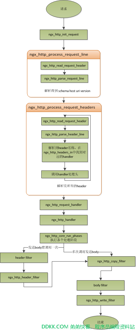 当Nginx 解析到两个回车换行符时,就表示请求头的结束,此时就会调用 ngx_http_process_request 来处理请求了。ngx_http_process_request 会设置当前的连接的读写事件处理函数为 ngx_http_request_handler,然后再调用 ngx_http_handler 来真正开始处理一个完整的http请求。这里可能比较奇怪,读写事件处理函数都是ngx_http_request_handler,其实在这个函数中,会根据当前事件是读事件还是写事件,分别调用 ngx_http_request_t 中的 read_event_handler 或者是 write_event_handler。由于此时,我们的请求头已经读取完成了,之前有说过,Nginx 的做法是先不读取请求 body,所以这里面我们设置 read_event_handler 为 ngx_http_block_reading,即不读取数据了。刚才说到,真正开始处理数据,是在 ngx_http_handler 这个函数里面,这个函数会设置 write_event_handler 为 ngx_http_core_run_phases,并执行 ngx_http_core_run_phases 函数。ngx_http_core_run_phases 这个函数将执行多阶段请求处理,Nginx 将一个 http 请求的处理分为多个阶段,那么这个函数就是执行这些阶段来产生数据。因为 ngx_http_core_run_phases 最后会产生数据,所以我们就很容易理解,为什么设置写事件的处理函数为 ngx_http_core_run_phases 了。在这里,我简要说明了一下函数的调用逻辑,我们需要明白最终是调用 ngx_http_core_run_phases 来处理请求,产生的响应头会放在 ngx_http_request_t 的 headers_out 中,这一部分内容,我会放在请求处理流程里面去讲。Nginx 的各种阶段会对请求进行处理,最后会调用 filter 来过滤数据,对数据进行加工,如 truncked 传输、gzip 压缩等。这里的 filter 包括 header filter 与 body filter,即对响应头或响应体进行处理。filter 是一个链表结构,分别有 header filter 与 body filter,先执行 header filter 中的所有 filter,然后再执行 body filter 中的所有 filter。在 header filter 中的最后一个 filter,即 ngx_http_header_filter,这个 filter 将会遍历所有的响应头,最后需要输出的响应头在一个连续的内存,然后调用 ngx_http_write_filter 进行输出。ngx_http_write_filter 是 body filter 中的最后一个,所以 Nginx 首先的 body 信息,在经过一系列的 body filter 之后,最后也会调用 ngx_http_write_filter 来进行输出(有图来说明)。