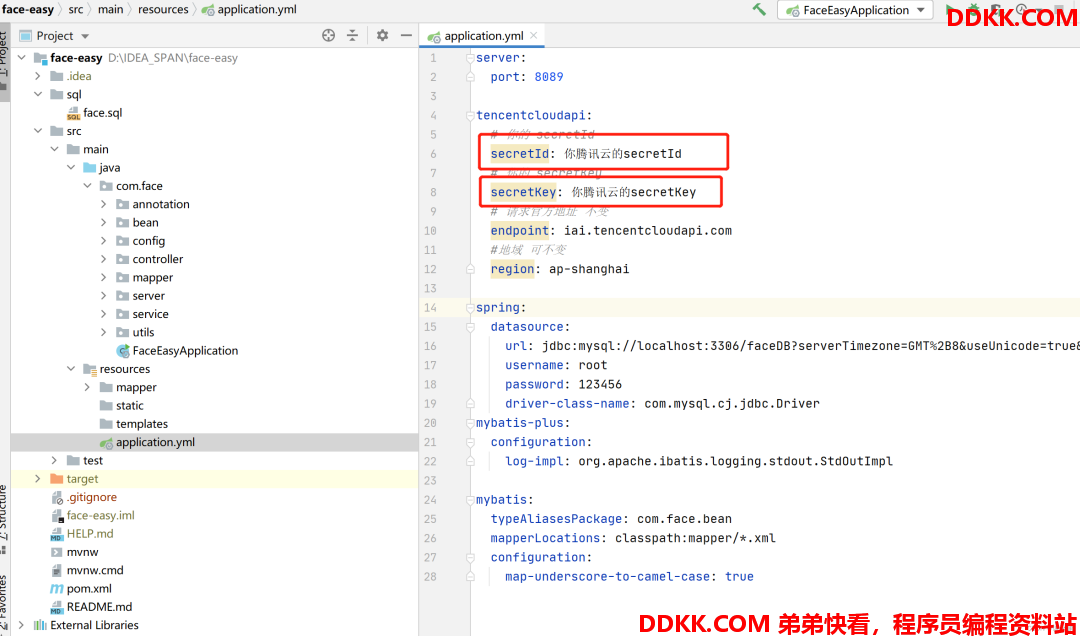 4,获取secretId和secretKey,并开通人脸服务之后,将secretId和secretKey配置到yml文件中