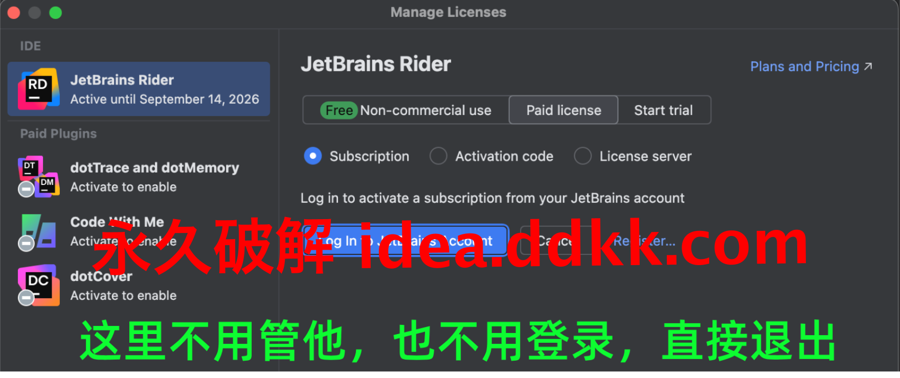 装好Rider之后,第一次启动会弹出一个登录对话框,提示你要先登录JetBrains账号;这时候千万别急着点登录,也别手快直接输入账号密码