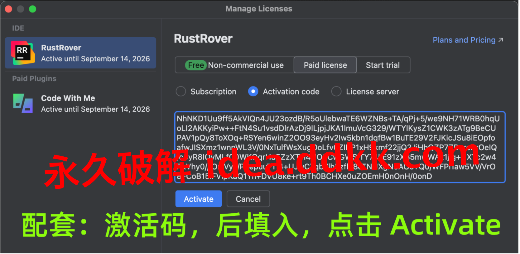 看到这个界面了吧,每个JetBrains产品用的激活码都不一样,别弄混了。RustRover有自己专用的激活码,别拿IDEA或者其他产品的激活码来用,用了会报无效。