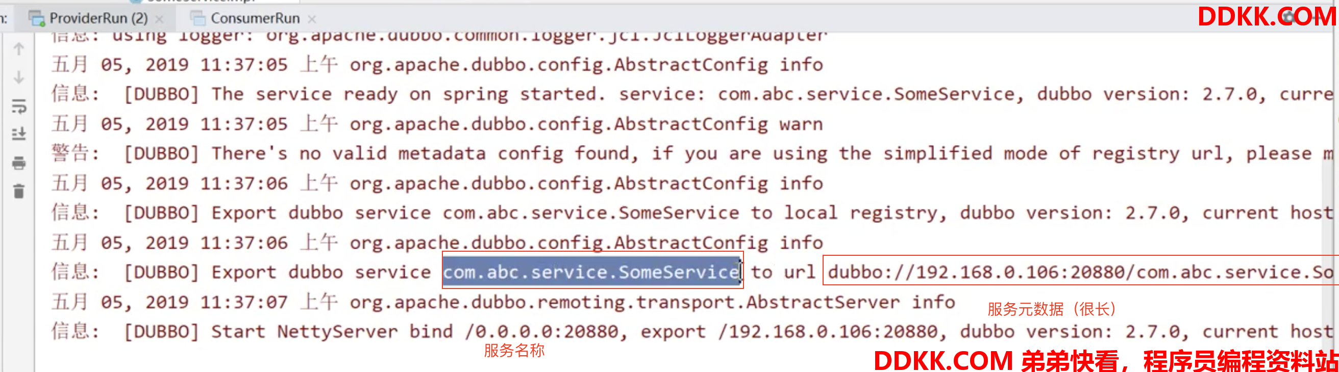 <dubbo:service interface="com.abc.service.SomeService" ref="someService"/>