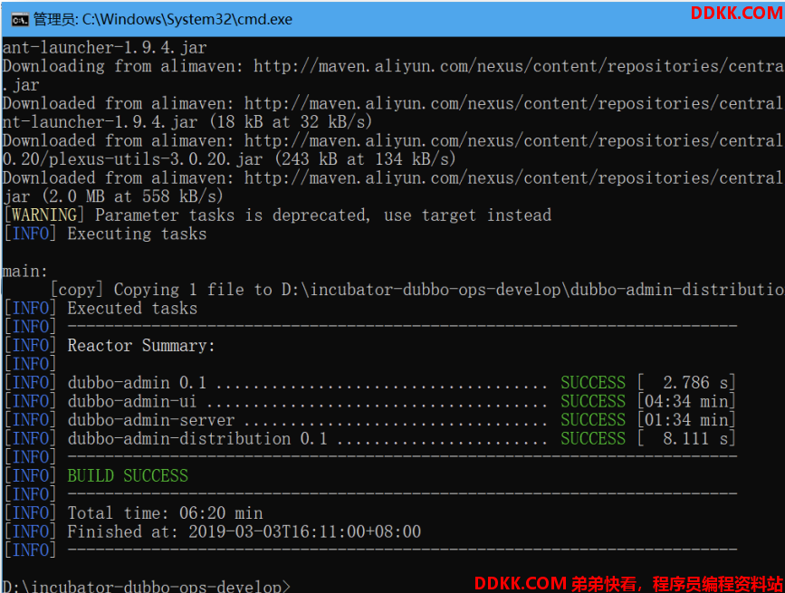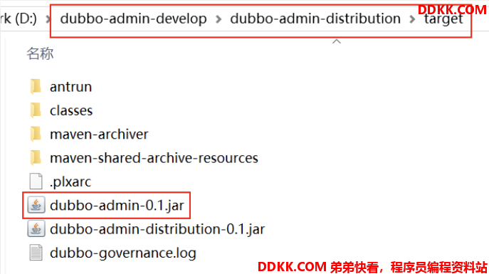 打包结束后,进入到解压目录下的 dubbo-admin-distribution 目录下的 target 目录。该目录下有个 dubbo-admin-0.1.jar 文件。该 Jar 包文件即为 Dubbo 管理控制台的运行文件,可以将其放到任意目录下运行。