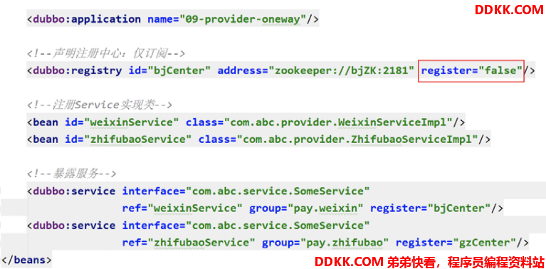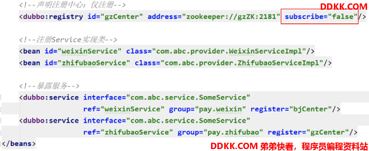 <!--暴露服务:同一个服务注册到不同的中心;不同的服务注册到不同的中心-->