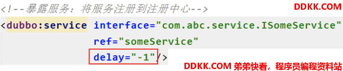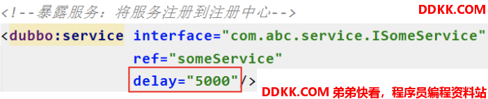 如果我们的服务启动过程需要 warmup 事件(预热事件),就可以使用 delay 进行服务延迟暴露。只需在服务提供者的dubbo:service/标签中添加 delay 属性。其值可以有三类: