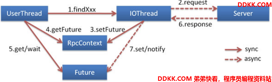 异步方法调用执行原理如下图所示,其中实线为同步调用,而虚线为异步调用。