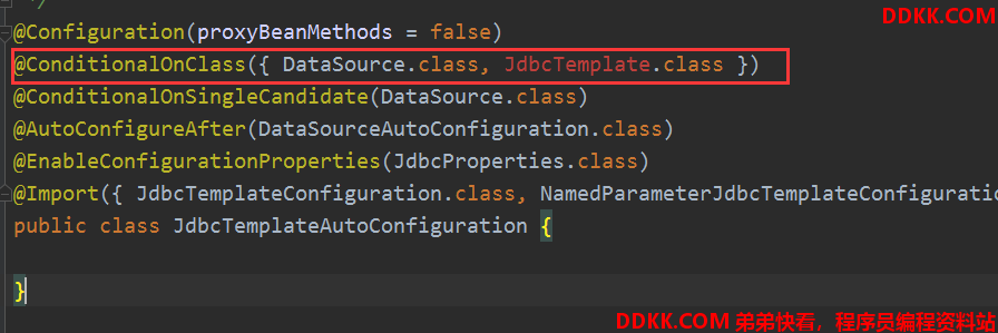 比如说JdbcTemplateAutoConfiguration,上面的ConditionalOnClass注解表示需要有这两个类才能加载。