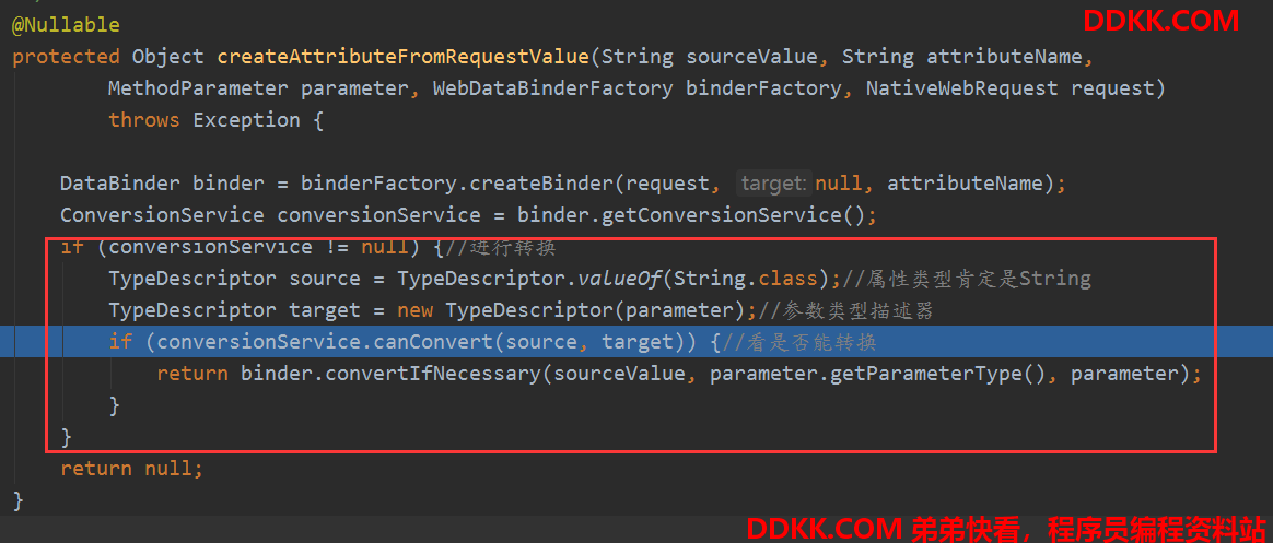 绑定器初始化完成后要进行数据的转换啦,先把属性值类型和参数类型封装成TypeDescriptor,然后判断是否可以转换,最后尝试转换。