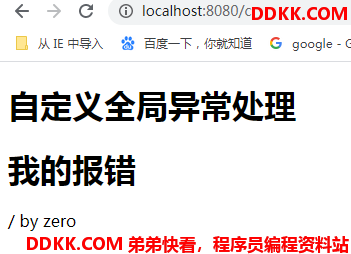 前有说到ExceptionHandlerExceptionResolver的getExceptionHandlerMethod会进行自定义的异常方法处理,但是这里连这个类都没有,当然不会进行异常方法处理,因此自定义的异常处理方法也就失效了,只有全局的一个异常处理器: